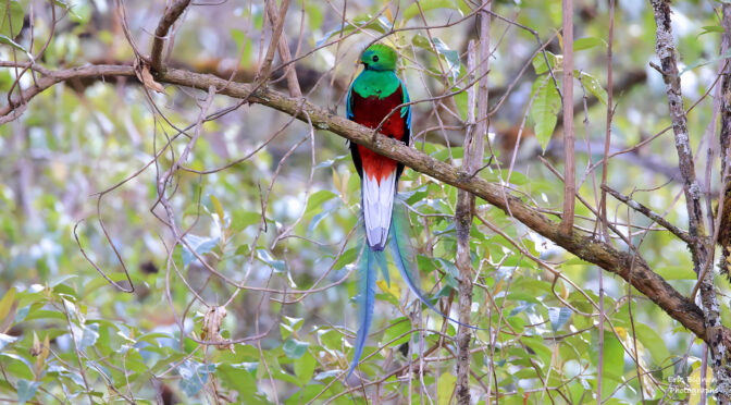 > Le Quetzal Resplendissant, espèces endémiques d’Amérique Centrale. Plutôt discret et craintif, il est difficile de l’approcher. Le mâle est a une longue queue ( jusqu’à 1 mètre) et une huppe sur la tête. Les femelles ont une queue plus courte et des couleurs un peu plus ternes. Oiseau sacré, il fut vénéré par les Mayas et les Aztèques.